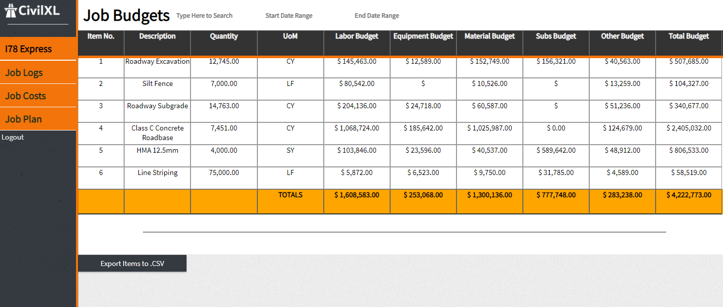 Have CivilXL figure out what to bill each pay cycle for you. Just select a start and finish date - that's it. CivilXL will tell you what line items to bill, your quantities to-date, and an export option to download your data to spreadsheets.