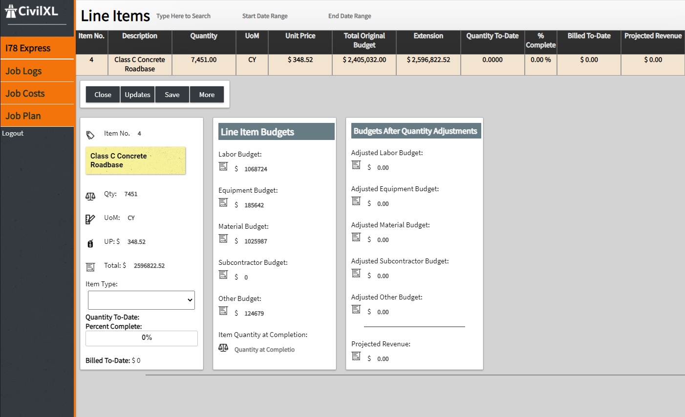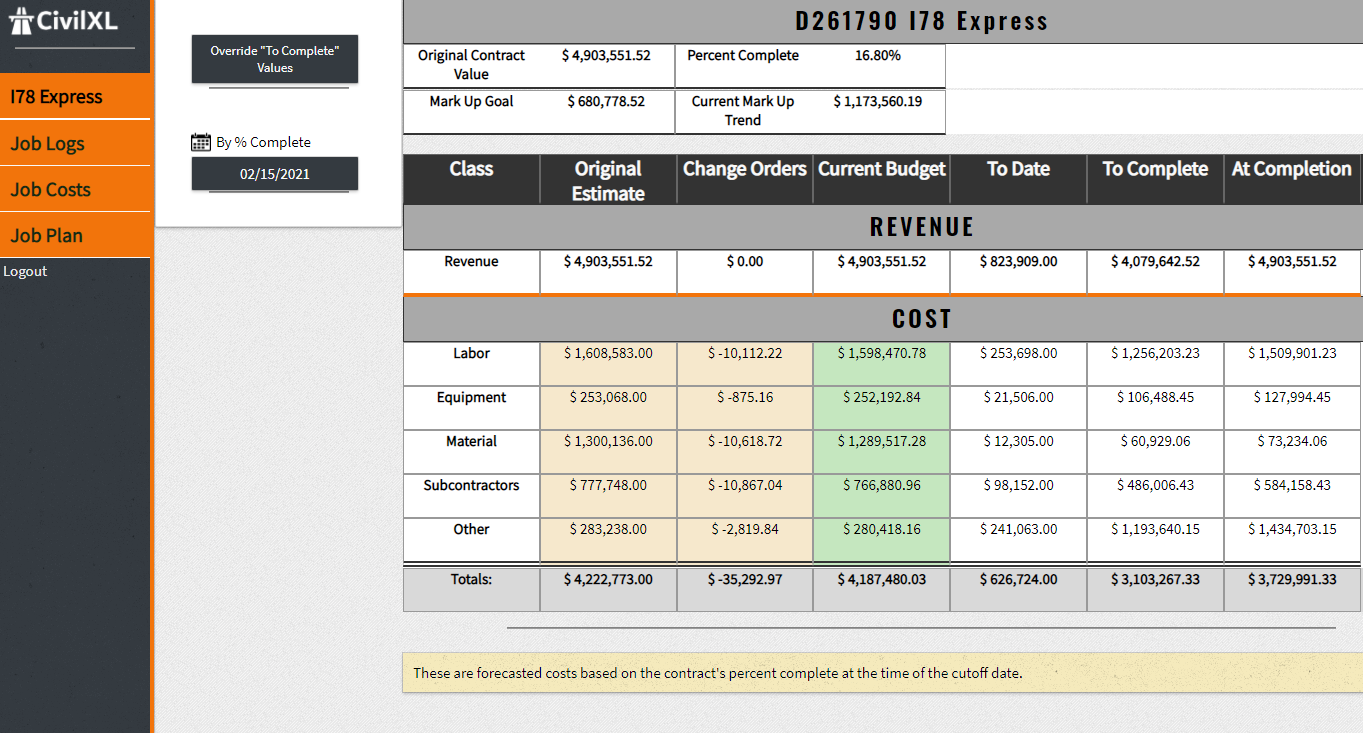 CivilXL automatically generates a Cost to Complete worksheet based on your progress. Simple capture your cost-to-date and run a forecast. Gain total control over your project.